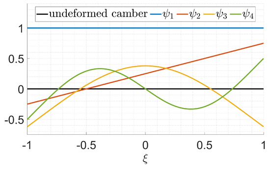 - shape functions representing camber morphing and corresponding to the third and fourth natural bending modes of vibration of a free-free beamwith , , , and , as coefficients of the approximation.