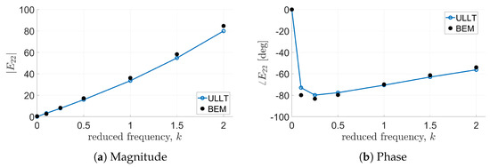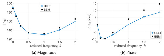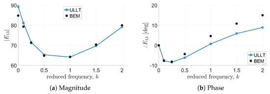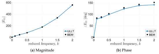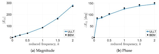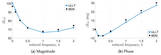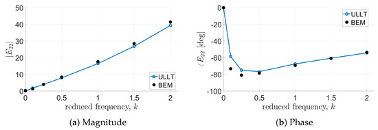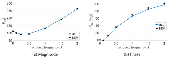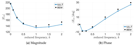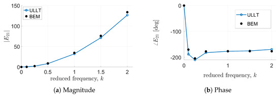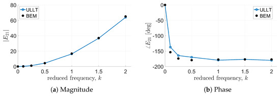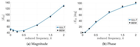 In these cases, all solvers considered provide almost identical results. Predictions from the ULLT solver and the BEM tool are in very good agreement, with some discrepancies appearing at high values of reduced frequency in most of the cases and at lower frequencies only for and phases correlation. It is worth noting that the transfer functions’ magnitude and phase determined by the present ULLT approach are evaluated through an FFT of the computed time-domain evolution of the loads.