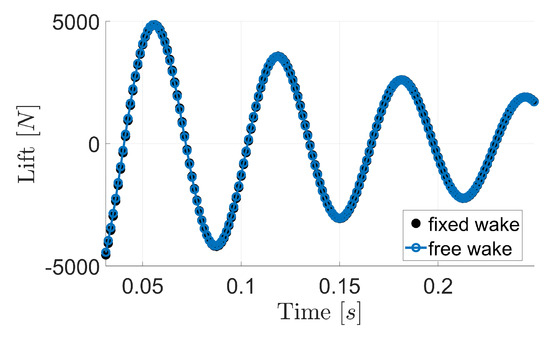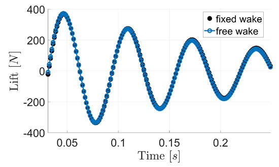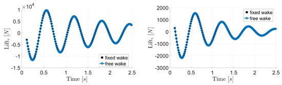 For the wing with m, reduced frequency equal to and Figure 15 and Figure 16 show the lift generated by, respectively, (with amplitude m) and (with amplitude m) (see Equation (29)) as obtained through the proposed solver under fixed-wake and free-wake assumptions.