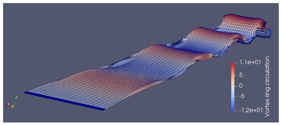 The results from the two wake models are very close, as expected. Indeed, for a translating wing, the wake roll-up generated by the distribution of vorticity yields a significant wake distortion at a distance from the wing such that its effects are almost negligible. This is apparent in Figure 17 which depicts the wake shape given by the free-wake mode solution corresponding to the input (plunging motion). In this picture, the quadrilateral rings representing the vortices released at each time step are colored by their intensity.