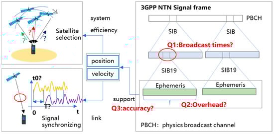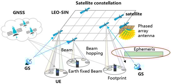 Based on the orbits of satellites within constellations and their ephemerides, users can predict which satellites will serve them in these corresponding locations, thereby supporting the selection of suitable satellites for access. Here, the ephemeris directly conveys the information on the positions and velocities of these satellites within LEO-SIN. This information can contribute to the estimation of the Doppler frequency offset (DFO), which is used to compensate for and resist the satellite channel response degradations [6,7]. Additionally, the ephemeris can be used to calculate the remaining time the satellite serves as a contact point to help with radio resource control (RRC), random access (RA), and hybrid automatic repeat requests (HARQs) [8]. In the case of an orbital altitude of about 300~1200 km with a minimum elevation angle of 30°, each satellite in orbit can serve a user for approximately 3~10 min, implying that the orbit extrapolation error must not be higher than 20 m.