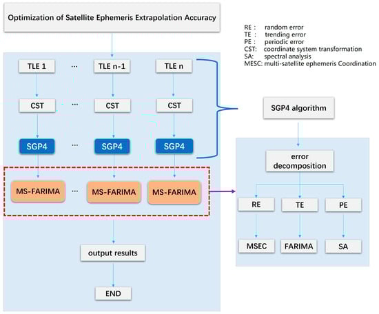 The left side of the flowchart represents the overall process of optimizing the satellite’s ephemeris extrapolation accuracy. The right side provides a detailed description of the proposed MS-FARIMA algorithm, including error decomposition and the specific methods used to eliminate each type of error.