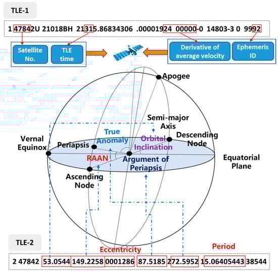 The TLE of the SKOEs describes the characteristics of the satellite’s ephemeris in the form of two lines with 70 columns each. The first line records basic information such as the satellite’s name and launch time. The second line records the parameters of the satellite’s operational orbit, which play the main role in orbit extrapolation. The details of the second line of the TLE table are shown in Table 1.