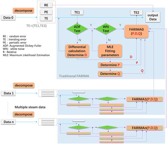FARIMA is a prediction model used to handle long-term time-series data. It combines autoregressive moving average (ARMA) models with fractional differencing to acquire long-term dependencies in data [28,29]. Traditional FARIMA algorithms can only predict single types of continuous data, and their accuracy decreases when an RE plays a role in the data. As the employed ephemeris data are of different types and are discrete, the MS-FARIMA algorithm is expected to improve the error. The MS-FARIMA algorithm design is shown in Figure 5.