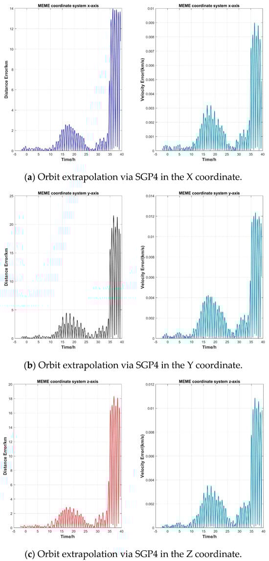 Figure 7 shows the distance error and velocity error of orbit extrapolation from to h when using the SGP4 algorithm in the X, Y, and Z coordinates. Here, due to the SGP4 algorithm employing the TEME coordinate system and the accurate ephemeris adopting the mean equator and mean equinox (MEME) coordinate system, the values from the TEME coordinate system are first transformed to the MEME coordinate system.