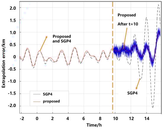 Figure 10 shows the extrapolation results when using the MS-FARIMA model. As Figure 10 shows, before h, the extrapolation error exhibited by the proposed MS-FARIMA is close to that of the original SGP4. After h, it is evident that the optimized extrapolation error for the proposed MS-FARIMA decreases by 33.5% compared to the original SGP4.