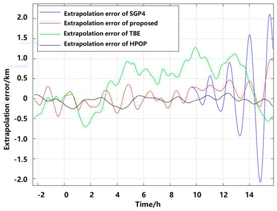 Figure 10 shows the performance comparison between the proposed algorithm and existing extrapolation algorithms, which are exemplified by the two-body extrapolation (TBE) algorithm, SGP4 algorithm, and the high-precision orbit propagator (HPOP) algorithm. As Figure 11 shows, the extrapolation error of the proposed algorithm is generally within 0.5 km after 15 h. In comparison, the extrapolation error of the SGP4 algorithm is generally beyond 0.5 km after 10 h. In the observed time, the extrapolation error of the two-body extrapolation algorithm is higher than that of the SGP4 algorithm and the proposed algorithm, and is also generally greater than 0.5 km. Additionally, the extrapolation error of HPOP generally remains within 0.3 km over 15 h. However, the HPOP algorithm needs to acquire more ephemeris data through broadcasting. From the experimental results, the prediction errors of all four algorithms exhibit certain fluctuations, but they show an increasing trend overall. This is consistent with the theoretical results.