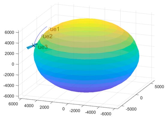 According to Equation (4), the satellite’s position and velocity are obtained in the ECEF coordinate system over a given period. Let the position vector of the UE be = , and the position vector of the satellite be = .