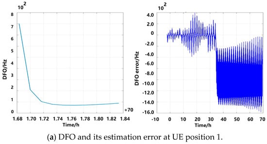 Figure 13 shows the DFO estimation performance of the proposed method. As Figure 13c show, within 35 h the DFO error estimate remains within 400 Hz. The subcarrier spacing used in this simulation is 15 kHz. To meet the requirements, the DFO error should be less than 4% of this spacing, which is 600 Hz. Therefore, using the optimized ephemeris for DFO calculations allows for predictions up to 35 h.