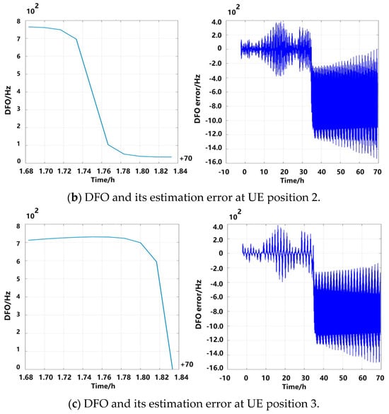 Figure 12 shows the simulated DFO examination scenario for the LEO-SIN. This figure shows the trajectory of the satellite over 10 min and the three positions of the UE. Based on the different positions of the UE, the position and velocity can be calculated and the DFO can also be calculated.