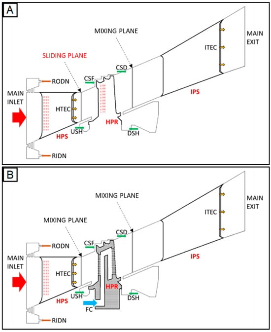 This section describes the techniques employed to generate the three-dimensional computational grids used for this numerical analysis. As indicated in the previous section, two models are adopted for the purpose of this investigation, namely the external one (Figure 1A) and the conjugate one (Figure 1B). In both approaches, the computational meshes for the high-pressure domains (HPS, HPR) are unstructured hexa-dominant with 20 structured prismatic layers near the walls. These meshes are generated with BOXER []. The IPS domain mesh is a H-O-H multi-block structured grid, with 20 layers in the O-block. This hexahedral mesh is generated by PADRAM [] which is a Rolls-Royce parametric design and rapid templated meshing tool. For all the meshes used, cell height first was set to achieve a y+ of 1 or below on all the walls.