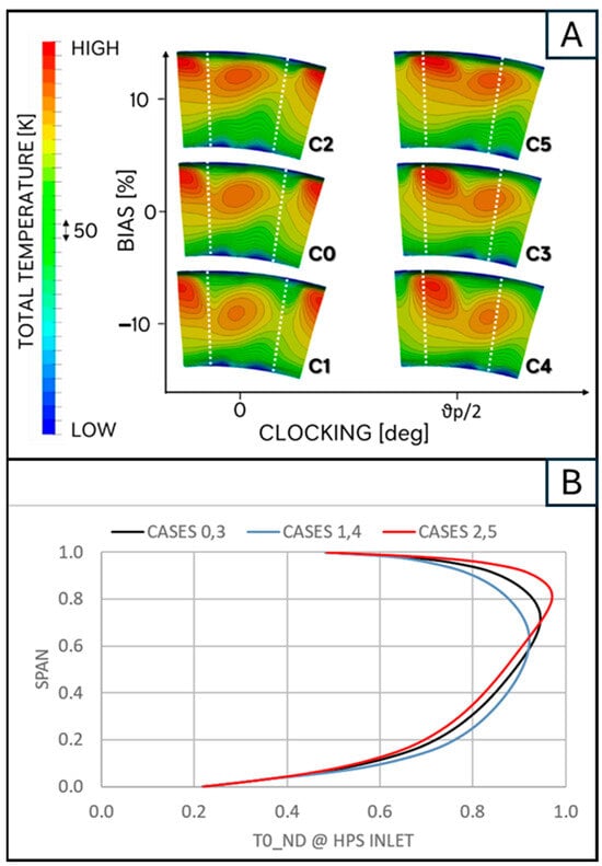 Total temperature contours at the HPS inlet corresponding to the different combinations of clocking and bias for the same cases listed in Table 1; the dashed white lines represent the HPS LE positions (A), and RTDs at the HPS main inlet for the different cases in terms of non-dimensional total temperatures T0_ND as a function of span with original distribution in black, low bias in blue, and high bias in red (B).