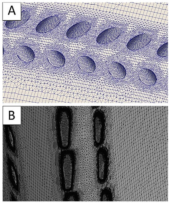 For the conjugate model (Figure 1B), the 1 ½ stage domain used the same stator meshes (HPS, IPS) of the external model. The conjugate HPR domain, to be used in the CHT simulations, is meshed in BOXER and, as previously mentioned, includes fluid and solid sub-domains. These meshes are generated simultaneously in a single BOXER run, thus ensuring a conformal interface between the fluid and solid grids. The fully featured rotor mesh presents 22 prismatic layers on all the surfaces, with the same first cell height adopted for the external model, ensuring a y+ of 1. The conjugate HPR mesh required significantly finer refinement with respect to the external one, due to the presence of various small-scale geometrical features such as ribs in the internal cavity of the mesh and the cooling holes. Particularly high levels of mesh refinement are applied in proximity of the edges of the cooling holes. The resulting significant increase in local mesh density is visible in Figure 3B. The same refinement was imposed on the opposite ends of the cooling holes, where they overlook the internal cavity of the HPR blade. The cell counts of the conjugate HPR fluid and solid meshes were, respectively, of 190 million and 60 million. For more details on the meshing technique adopted for this part of the work, the reader can refer to [].