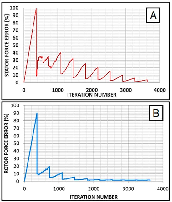 Convergence of the phase-lag simulation in terms of stator force error (A) and rotor force error (B) monitored during the iterative calculation process.
