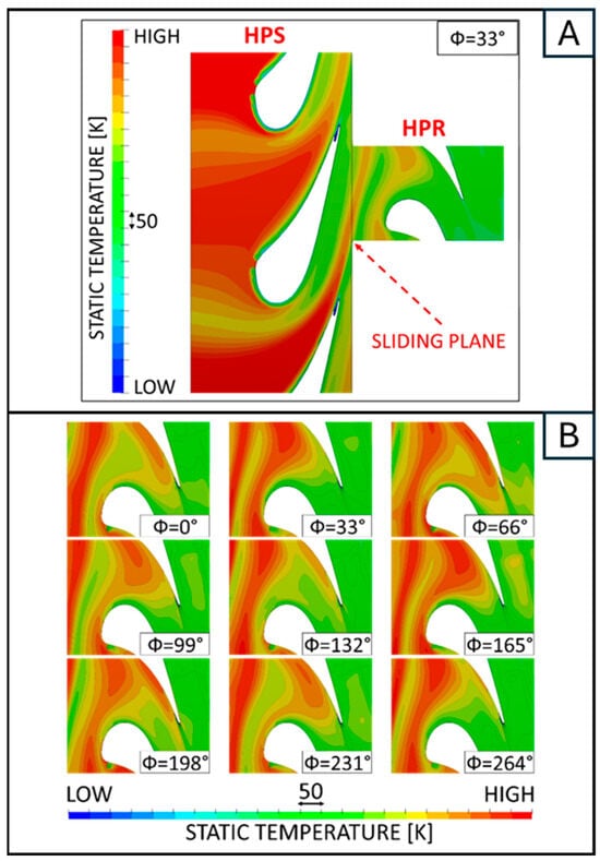 External phase-lag CFD, case 0 (baseline) instantaneous HPS and HPR static temperature contours at a mid-span section at cycle phase Φ = 33° with a view over the HPS–HPR sliding plane (A) and External Phase-lag CFD, case 0 (baseline) instantaneous HPR static temperature contours at a mid-span section at different period phases Φ (B)—Pictures distorted.