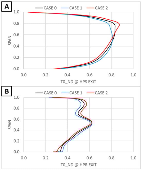 External phase-lag CFD, non-dimensional RTDs for case 0 (no bias, black), case 1 (negative bias, blue), and case 2 (positive bias, red) downstream of HPS (A) and downstream of HPR (B) resulting from cycle-averaged solutions, plotted as a function of blade span. Refer to Figure 1A for the locations of the RTDs.