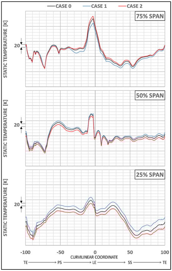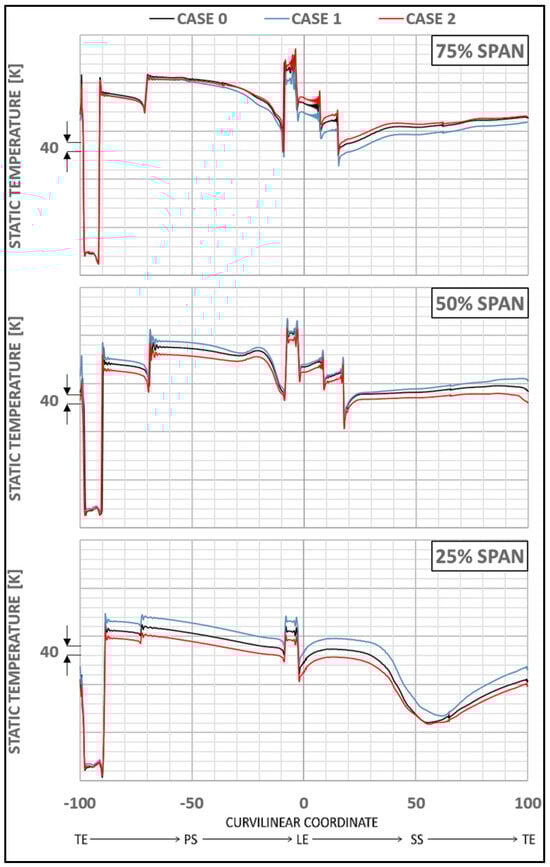 External phase-lag CFD, case 0 (baseline), near-wall gas static temperatures at three constant-span sections along the HPR blade height: 25% (blue), 50% (grey), and 75% (orange) resulting from cycle-averaged solutions, plotted as a function of the section’s curvilinear co-ordinate.