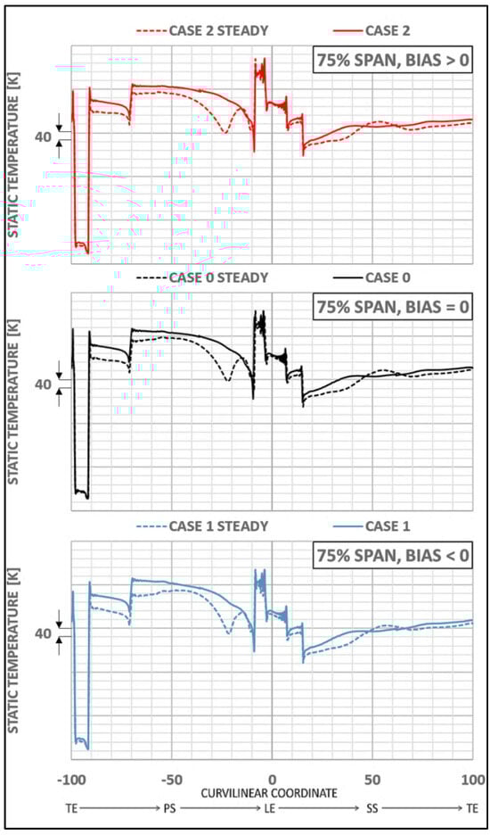 While it is self-evident that being able to transfer the circumferential variability at the HPS–HPR interface is vital to study clocking, it is interesting to assess whether the same is true when the analysis is focused on radial bias. In Figure 10, a comparison between the steady-state and phase-lag solutions is displayed for the 75% span section for the three bias values. The Figure shows that, while peak LE temperatures appear to be unaffected, the steady-state and phase-lag models predict remarkably different temperatures throughout the PS of the blade section. On the one hand, this means that even the current steady-state CHT simulations can provide meaningful results on global (LE @ 75% span) peak HPR temperatures, which are the primary focus of the present investigation. On the other hand, it is evident that excluding this unsteady interaction in the model will result in significant loss of accuracy (large underestimation) on the temperature predictions for the PS region of the blade. It is also worth noting that, although the steady-state temperature values themselves are sometimes off by more than 120 K, the deltas due to bias predicted by the steady state model between the cases shown in Figure 10 appear to be roughly in agreement with the phase-lag ones.