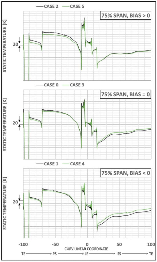 In this section, the effects of inlet traverse clocking on surface temperatures are discussed. Figure 11 shows the HPR near-wall gas static temperatures, focusing on the critical (75%) span section for the different cases. The curves in black indicate the response to the zero-clocking traverse, while the cases in green pertain to the half-pitch clocking cases. Each plot in Figure 11 compares the two curves for a given radial bias value. To enhance the visibility of the delta between the two sets of curves in the relevant parts of the section, the lower limit of the vertical (temperature) axis has been increased. As a result of this, a small portion of the curves in the TE-PS region (CC ≈ −95) is excluded from the representation. The missing portion of the section did not add any useful information, as the two sets of curves appeared to be superimposed. This is due to the prevalent effect of the TE film cooling strip model, locally imposing the same near-wall gas temperature equal to the coolant temperature, regardless of the choice of inlet temperature distribution.