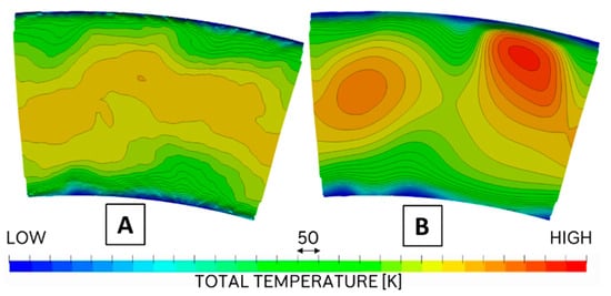 Total temperature contours at the HPS inlet corresponding to the new optimized ECU distribution (A) versus the best-performing parametric one, i.e., CASE 4 (B)—pictures distorted.