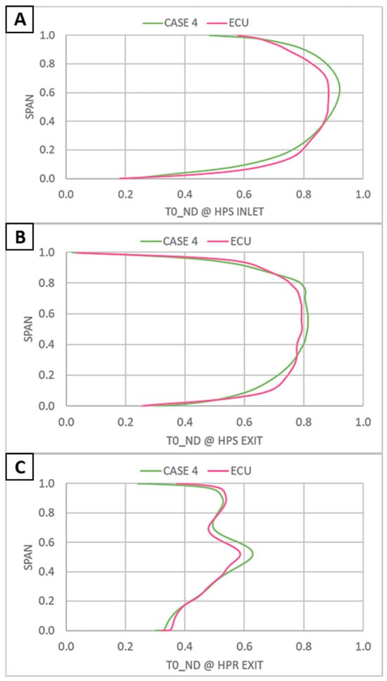 This was obtained through iterative matching aimed at providing the same amount of energy as the baseline and parametric cases analyzed in the previous sections. The energy content was evaluated based on the mass-weighted total temperature integral of the RTD curve over the whole span. A comparison between the two HPS inlet circumferentially averaged radial distributions can be seen in Figure 13A. The ECU RTD represented by the purple curve in Figure 13A appears to have a marked hub bias. In terms of traverse migration, Figure 13B and Figure 13C, respectively, show the RTDs at HPS exit and HPR exit. The effect of hub bias can be still seen at these axial stations, while in the upper portion of the span the ECU traverse leaves the HPR row with slightly higher temperatures (see Figure 13C for 0.8 < SPAN < 1.0). This effect is already present at the HPS exit (Figure 13B) in the higher fifth of the span, where the pink curve presents higher values than the black one, although this is less evident due to the high slope of the curves in that region.