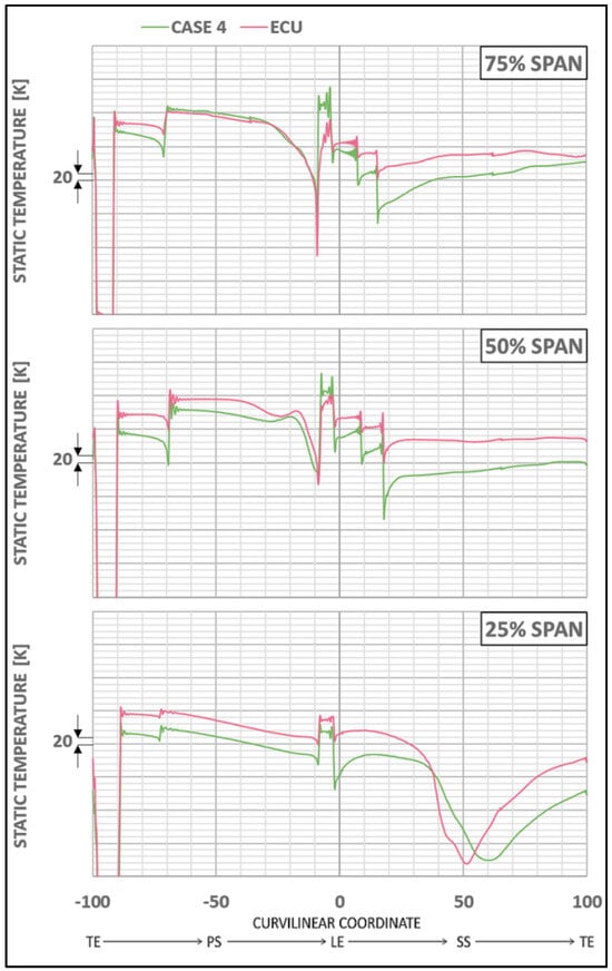 Figure 8 shows the near-wall gas static temperature values on the HPR surface at different span sections. As shown in Figure 8, by adopting a flatter, negatively biased traverse (case 1) a ~50 K peak temperature reduction can be achieved in the LE region at a span of 75%, followed by a smaller reduction (~30 K) in the LE-PS region. This tendency is inverted at the lower span sections, especially at 25% span where the negative-bias case appears to provide an almost constant positive temperature offset at around 40 K. As mentioned before, the benefits of a temperature reduction in the top third of the blade outweigh an opposite-sign effect in the lower part.