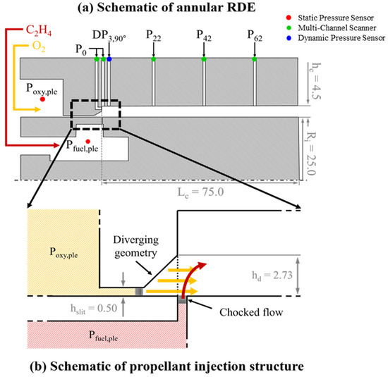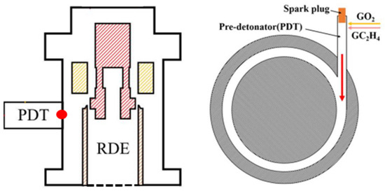 Figure 2 presents a schematic of the RDE equipped with the pre-detonator (PDT) utilized for initial ignition in this study. To initiate the RDE, a PDT with an inner diameter of 4.22 mm and a length of 110 mm was employed. The PDT was installed tangentially to the RDE combustion channel to ensure that the detonation wave generated by the PDT propagates directly into the RDE combustion chamber without branching. The same propellants used in the RDE combustion were also used for the PDT to maintain consistent combustion conditions. The PDT was ignited using a spark coil and scarf plug, providing the initial ignition source tangentially to the RDE combustion channel.