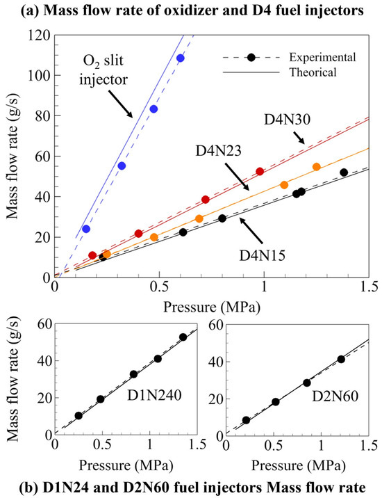 Theoretical mass flow rate and experimental mass flow rate reflecting production error: (a) Mass flow rate of oxidizer and D4 fuel injectors. (b) D1N24 and D2N60 fuel injectors’ mass flow rate.