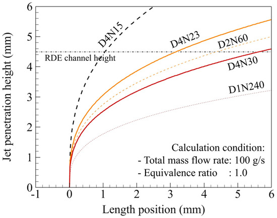 The jet penetration height was calculated using Equation (2) from the research findings of Gruber et al. [56], based on practical fuel injector parameters. The calculation was conducted under conditions of an equivalence ratio of 1.0 and a total mass flow rate of 105 ± 5 g/s. To determine the jet penetration height, the jet momentum ratio, J, was first computed using Equation (3). The necessary values for calculating the jet momentum ratio were derived from Equations (4) and (5). Given the area ratio and experimental conditions of the RDE oxidizer slit injector and considering that the flow is expanding under all conditions, the static pressure, P, was assumed to be 0.1 MPa. The total pressure, P0, was obtained using the plenum pressure, Pple, from the earlier mass flow rate measurement experiments, while the freestream Mach number, M∞, was derived using the pressure ratio. The fuel pressure, Pjet, was modeled under choked flow conditions due to the sufficiently high pressure in the fuel plenum. With the calculated jet momentum ratio, J, the jet penetration height was then determined. Figure 5 illustrates the jet penetration height for each fuel injector. Referring to the findings of Plaehn et al. [36], the maximum penetration height along the length direction was observed to be 6 mm.