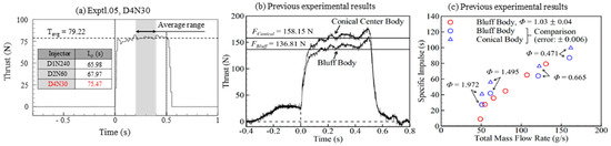 To validate the performance of the RDE in this study, a comparative analysis was conducted against our previous research on RDE performance [46]. Figure 8a presents the thrust and specific impulse results obtained under the conditions of a mass flow rate of 107 g/s and an equivalence ratio of 1.01. Figure 8b,c illustrate results from our previous studies. Despite differences in equivalence ratio and mass flow rate, a comparison of the thrust data reveals a consistent trend in the thrust generated by the RDE across these studies, suggesting a reliable replication of RDE performance. Although further analyses and comparative studies are required, these findings support the validity of the RDE’s performance. Additionally, when comparing specific impulse data, Figure 8c shows that, under conditions of an equivalence ratio of 1.03 ± 0.04 and a flow rate of 100 g/s with a bluff body, the specific impulse values closely match those obtained in the current study, further reinforcing the consistency and reliability of the RDE’s performance.
