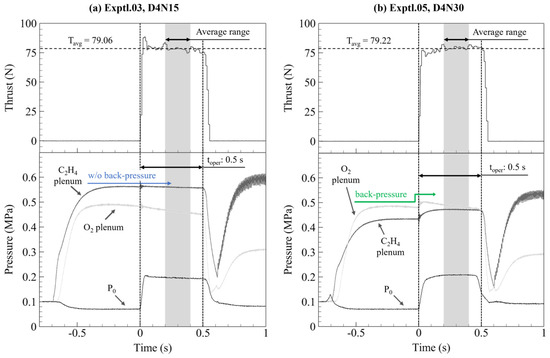 The history of thrust and pressure: (a) Exptl.03, D4N15 without back-pressure and (b) Exptl.05, D4N30 with back-pressure.