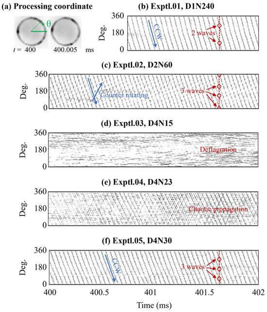 High-speed-camera pictures and image-processing images for combustion-mode verification: (a) high-speed-camera snapshots and image-processing coordinate; (b) 2-wave detonation of Exptl.01, D1N240; (c) 3-wave detonation with counter-rotating of Exptl.02, D2N60; (d) deflagration with D4N15 of Exptl.03; (e) Exptl.04, chaotic propagation with D4N23 fuel injector; and (f) 3 detonation waves with D4N30 of Exptl.05.