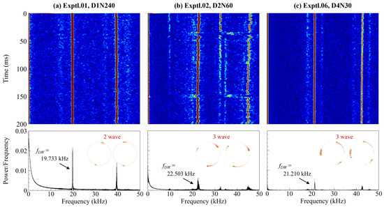 Detonation propagation analysis based on STFT and FFT results: (a) wave mode with D1N240 of Exptl.01, (b) relatively unstable propagation with D2N60, and (c) 3-wave mode with D4N30 of Exptl.06.