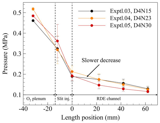Figure 9 represents the thrust and pressure history of Exptl.03 and Exptl.05. The ignition moment was described as the reference time. To stabilize the plenum pressure, the propellant is supplied for 0.8 s, followed by ignition, using a pre-detonator. Immediately, after ignition, the thrust and chamber pressure increase significantly. The experiment is performed for 0.5 s, and nitrogen purge is performed after a delay of about 0.1 s. The experiment was conducted over a brief duration of 0.5 s to prevent potential damage to the RDE equipment. For performance calculations, data from the 0.2 to 0.4 s interval were used, as combustion was determined to have stabilized during this period based on the analysis of pressure and thrust histories.