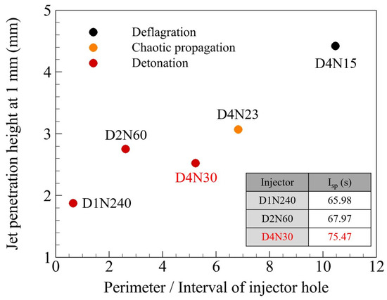 Figure 13 illustrates the specific impulse of injectors operating in both combustion and detonation mode, as influenced by parameters affecting fuel mixing. Injectors D4N23 and D4N15, which exhibited relatively poor fuel-mixing conditions, did not achieve detonation mode. Conversely, detonation mode was observed in injectors with narrower hole spacing. Among the injectors compared, D4N30, which features a relatively wider gap between holes, demonstrated the highest specific impulse. While this configuration may be less advantageous for fuel jet penetration height compared to D1N240, the finding suggests that excessive jet penetration height could negatively impact RDE performance. Moreover, the data indicate that the optimal jet penetration height is also crucial for an efficient injector design.