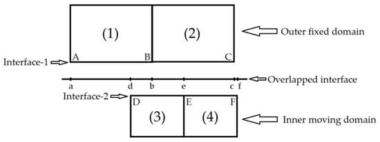 The sliding grid technique does not require the grid points on the two interfaces to coincide, as illustrated in Figure 1. Regions (1) and (2) are outer fixed domains, while regions (3) and (4) are inner moving domains. There are two overlapping interfaces, Interface-1 and Interface-2, between the regions. For example, the D-E surface is not considered when calculating the flux from the outer domain crossing the interface into the inner domain (3). Instead, the information from domains (1) and (2) is brought into domain (3) using the d-b and b-e surfaces to complete the data exchange between the inner and outer domains, ensuring flux conservation.