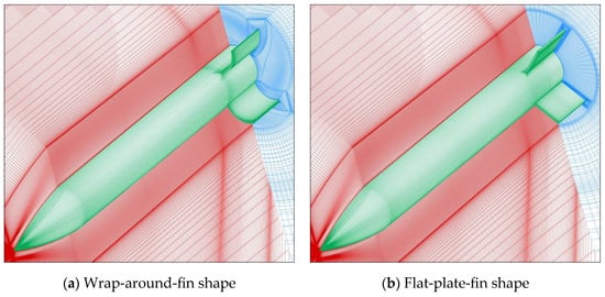 The distribution of the grid nodes for the two shapes considered in this study is the same, with an equal number of grids. The computational grid is composed of hexahedral structured grids with a total of 13 million cells, ensuring that the first layer grid height meets y+ < 1 and the wall grid growth rate is kept below 1.1. The rotational motion of the projectile is achieved using the sliding mesh technique, and the computational domain’s division is shown in Figure 3. Figure 4 shows the mesh topology structures of the two shapes.
