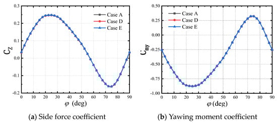 Figure 7 and Figure 8 show the curves of the side force and yawing moment for the five cases with varying angles of rotation. From the figures, it can be observed that the error between the results of case A and cases B and E is within 0.5%. It is considered that the mesh and time-step settings of case A can meet the requirements of subsequent calculations. Therefore, the configuration of case A is used for the calculations in the subsequent work.