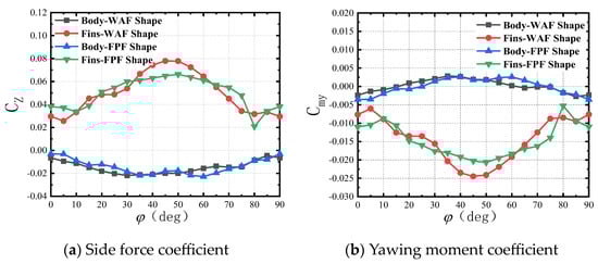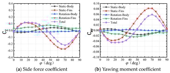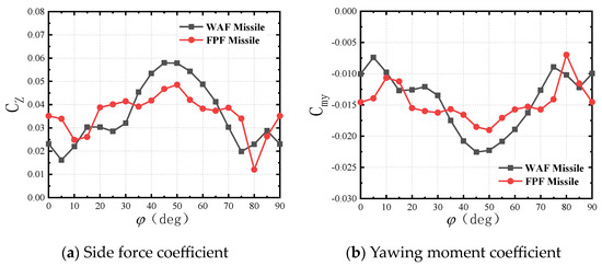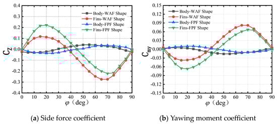 Figure 15 shows the curves of the static side force and yawing moment coefficients of the body and fins of the wrap-around-fin and flat-plate-fin shapes over one cycle. From Figure 15, the body and fins of both shapes exhibit significant differences in the side force and yawing moment, which indicates that the additional side force and yawing moment have a considerable impact on the aerodynamic characteristics of both the tail fins and the body. When investigating the mechanism behind the generation of the static side force and yawing moment of the missile, separate analyses of the body and tail fins are necessary.