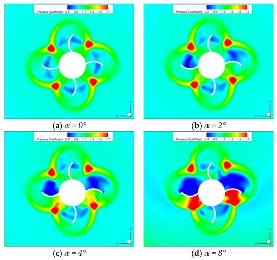 Figure 12 shows the pressure coefficient contour map on the midsection of the Wrap-Around-Fin when Ω = 0. The figure shows that the flow near the Wrap-Around Fin at α = 0° is not symmetrical in terms of the plane but exhibits axial symmetry, with the X-axis as the axis of symmetry. Under this condition, the aerodynamic forces on the non-adjacent pair of fins are equal in magnitude and opposite in direction, thus the total side force and yawing moment of the four fins sum up to zero. As the angle of attack increases, the flow field near the fins no longer exhibits axial symmetry, resulting in aerodynamic forces acting on the four fins that cannot cancel each other out, leading to the generation of side force and yawing moment. Therefore, only when the angle of attack is not zero, the Wrap-Around-Fin missile will have static side force and yawing moment. In the study of static side force/yawing moment in this paper, the objects are missiles with an angle of attack, and the analysis is based on the premise that the angle of attack is not zero.