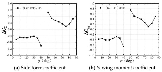 Figure 13 shows the curves of the static side force and yawing moment coefficients of the wrap-around-fin and flat-plate-fin shapes as a function of the roll angle at Mach number Ma = 2.5 and angle of attack α = 15°. The patterns of the side force and yawing moment for both shapes appear similar in Figure 13. However, the flat-plate-fin shape exhibits symmetry in the side force and yawing moment curves over one cycle of variation, resulting in a zero time-averaged static side force and yawing moment within one cycle. On the other hand, the wrap-around-fin shape’s side force and yawing moment curves over one cycle are asymmetrical, leading to a non-zero time-averaged value. This indicates that the curvature of the tail fin introduces an additional side force and moment for the wrap-around-fin missile. Figure 13 also shows the curve of the difference in the side force and yawing moment between the two shapes over one cycle as a function of the rotation angle. This curve reflects the magnitude of the additional side force and yawing moment generated by the curvature of the tail fin. Under different rotation angles, the flat-plate-fin missile exhibits varying side forces and yawing moments. These side forces and yawing moments add up under certain rotation angles with the additional forces and moments caused by the curvature of the fins, while they cancel each other out at other rotation angles. Therefore, to assess the impact of the fin curvature, the ratio of their absolute values is presented in Figure 14. When the values in Figure 14 are positive, it indicates an additive relationship between the additional moments and the moments of the FPF; conversely, when the values are negative, it signifies a counteracting relationship. It can be observed from Figure 14 that the additional force and moment generated by the tail fin curvature can exceed 40% of the static side force and moment of the flat-plate-fin shape at most rotation angles. Regardless of whether they add up or are canceled out, this indicates that the curvature of the fins has a significant impact on the side force and yawing moment characteristics of the missile. This is the primary reason for the differences in the static side force and yawing moment between the wrap-around-fin and flat-plate-fin shapes.