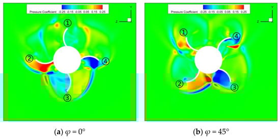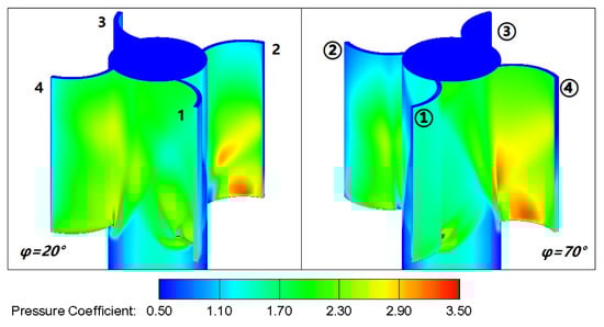 In Figure 16, a contour map of the pressure distribution in the midsection of the tail fins of the WAF and FPF shapes at φ = 45° is presented. The flow field near the flat-plate fin demonstrates a symmetrical distribution at φ = 45°, whereas the flow field near the WAF lacks symmetry. Using the two tail fins on the windward side as an example for analysis, compared to the FPF, when the airflow passes over the WAF, the middle of the right WAF is bent upward, causing the compression of the airflow beneath the wing. As a result, the pressure beneath the right WAF increases, while the left fin experiences the opposite effect, leading to reduced pressure. The side force and yawing moment acting on these two fins cannot cancel each other out. Figure 17 shows the contour maps of the windward surface pressure coefficients near the WAF at roll angles of 20° and 70°. The wings with the same labels are in spatial positions that are symmetrical to each other, but, due to the curvature of the WAF, the airflow passing over symmetrically positioned tail fins does not exert symmetrical forces on the tail fins. As an example, in Figure 17, for the pair of tail fins labeled as 4, the windward surface is convex at φ = 20° and concave at φ = 70°. It is evident that the side force and yawing moment acting on this tail fin within one rotation cycle cannot be self-canceled.