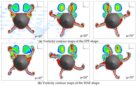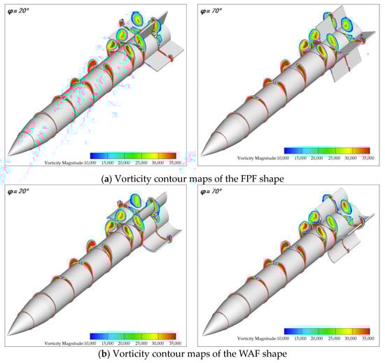 The vorticity contour maps of the two shapes at roll angles of 20° and 70°.