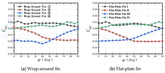 The variation in the effective angle of attack significantly affects the magnitude of the side force and yawing moment on the tail fin. The main factors affecting the effective angle of attack on the tail fin are rotation motion and the rotation–angle coupling effect. For a rotating missile, rotation increases the effective attack angle of the convex surface and decreases that of the concave surface. When the tail fin rotates, the pressure increases on the convex surface and decreases on the concave surface. When a rotating missile has an angle of attack, the effective angle of attack on both sides of the angle of attack plane will change due to rotation. The tail fin on one side of the angle of attack plane rotates into the wind, increasing the effective angle of attack, while, on the other side, it rotates downwind, decreasing the effective angle of attack. From Figure 24 and Figure 25, it can be observed that the pressure increases on one side and decreases on the other side, which is the result of the change in the effective angle of attack induced by rotation. Figure 26 and Figure 27 reveal that at φ = 0°, the side force and yawing moment of tail fins 1 and 3 are significant, indicating that the change in the effective angle of attack induced by rotation is the primary factor influencing the induced side force on the rotating fin. To analyze the impact of the rotation–angle coupling effect, it is necessary to exclude the influence of the fin curvature; hence, a flat-plate-fin shape is selected for analysis here. From Figure 26b, it can be observed that the intersection of the curves for fins 2 and 3 is at φ = 43° rather than φ = 45°. At φ = 45°, the side force of fin 2 is slightly greater than that of fin 3, reflecting the difference in the effective angle of attack between the two fins. Fin 2 is on the windward side with a larger effective angle of attack, while fin 3 is on the downwind side with a smaller effective angle of attack. In terms of the magnitude of the side force, the variation caused by the rotation–angle coupling effect is minimal, making it a secondary factor influencing the induced side force on the tail fin due to rotation.