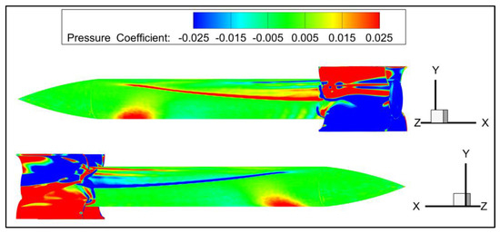 Figure 28 presents the pressure coefficient variation induced by the rotation rate on the body sections of the two missiles; the numerical calculation conditions are Ma = 2.5, α = 15°, and ω = 314.16 rad/s. From Figure 28a, it can be seen that rotation causes the asymmetric distortion of the flow of the missile body, resulting in increased pressure on one side and decreased pressure on the other side, generating a side force along the negative z-axis and the corresponding yawing moment. However, from Figure 23, it is found that as the rotation angle increases from 0° to 90°, the magnitude of the induced side force on the rotating missile body first increases and then decreases, reaching its maximum value near φ = 45°. Because the flight speed is supersonic, the forebody of the missile is not affected by the aerodynamic interference of the tail fins. Therefore, this variation in the side force can only occur in the inter-wing region, caused by the interference of the tail fin rotation on the Magnus effect of the missile body. Due to the different states of the four tail fins during the missile rotation process, the effects of tail fin rotation on the inter-wing flow field are also different. From Figure 28b, it can be seen that the pressure distribution in the inter-wing region of the missile body is very complex, and the pressure changes are more drastic than those on the forebody of the missile.