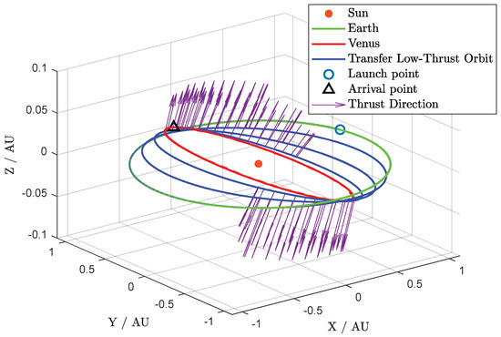 We only consider the Sun’s gravity and the electric propulsion. Consequently, the motion of the spacecraft can be described by Equation (1).