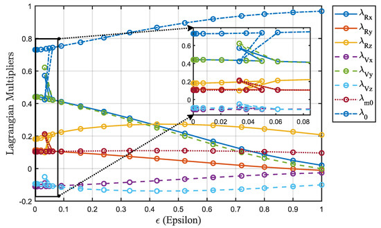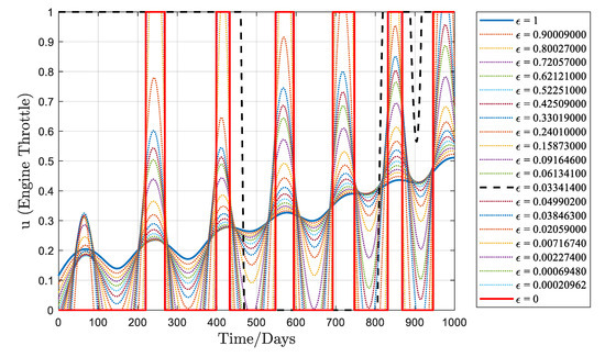Figure 7 depicts the curves of as decreases during the homotopic process. The effectiveness of the smoothing technique in resolving the fuel-optimal bang-bang control problem is evident. The entire homotopic process approximates from the solution with equal to 1 to the solution with equal to 0.