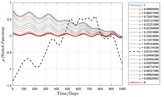 Figure 3 and Figure 4 depict the thrust and switching function profiles during the homotopic process, respectively. With equal to 0, the thrust mode transitions to bang-bang control. Figure 4 illustrates that with at 0, fluctuates with small amplitudes around the value of 0. If is below 0, the spacecraft thrusters are fully open; if exceeds 0, the thrusters are closed. Additionally, in the fuel-optimal problem, variation in the value of leads to fluctuations in the valleys of the curve, causing changes in the number of arc segments intersecting 0. This alteration results in the disappearance or increase in thrust arc segments, consequently altering the switching strategy of the spacecraft thrusters.