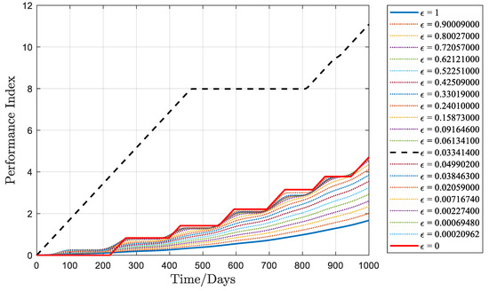 Figure 5 depicts a schematic representation of the performance index over time with different , validating Equation (25). As decreases, the performance index at the final moment for the optimal solution of each auxiliary problem grows. With equal to 0, the performance index remains unchanged during the coasting arcs.