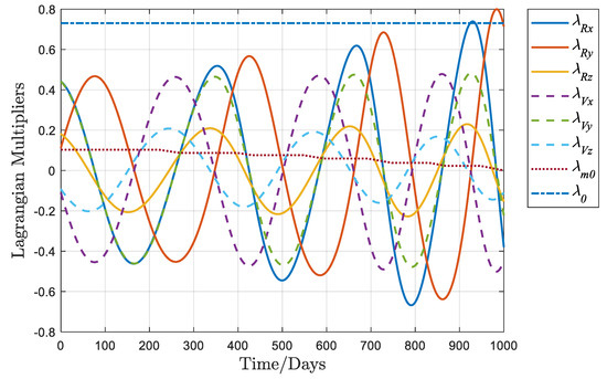 Figure 6 depicts the curves representing the eight Lagrange multipliers of the fuel-optimal orbit with equal to 0. Abrupt changes in the parameters are evident at the moment of thrust switching. remains constant throughout; decreases solely during the thrust arcs, remains constant during the coasting arcs, and reaches 0 at the terminal moment; the other Lagrange multipliers exhibit, to a certain extent, the fluctuating properties of the sinusoidal function.